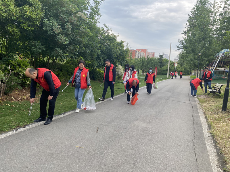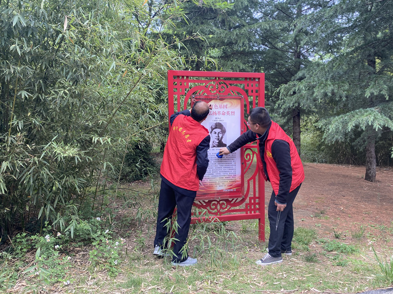参观过后,全体职工在劳模公园捡拾垃圾、擦拭宣传栏和座椅。